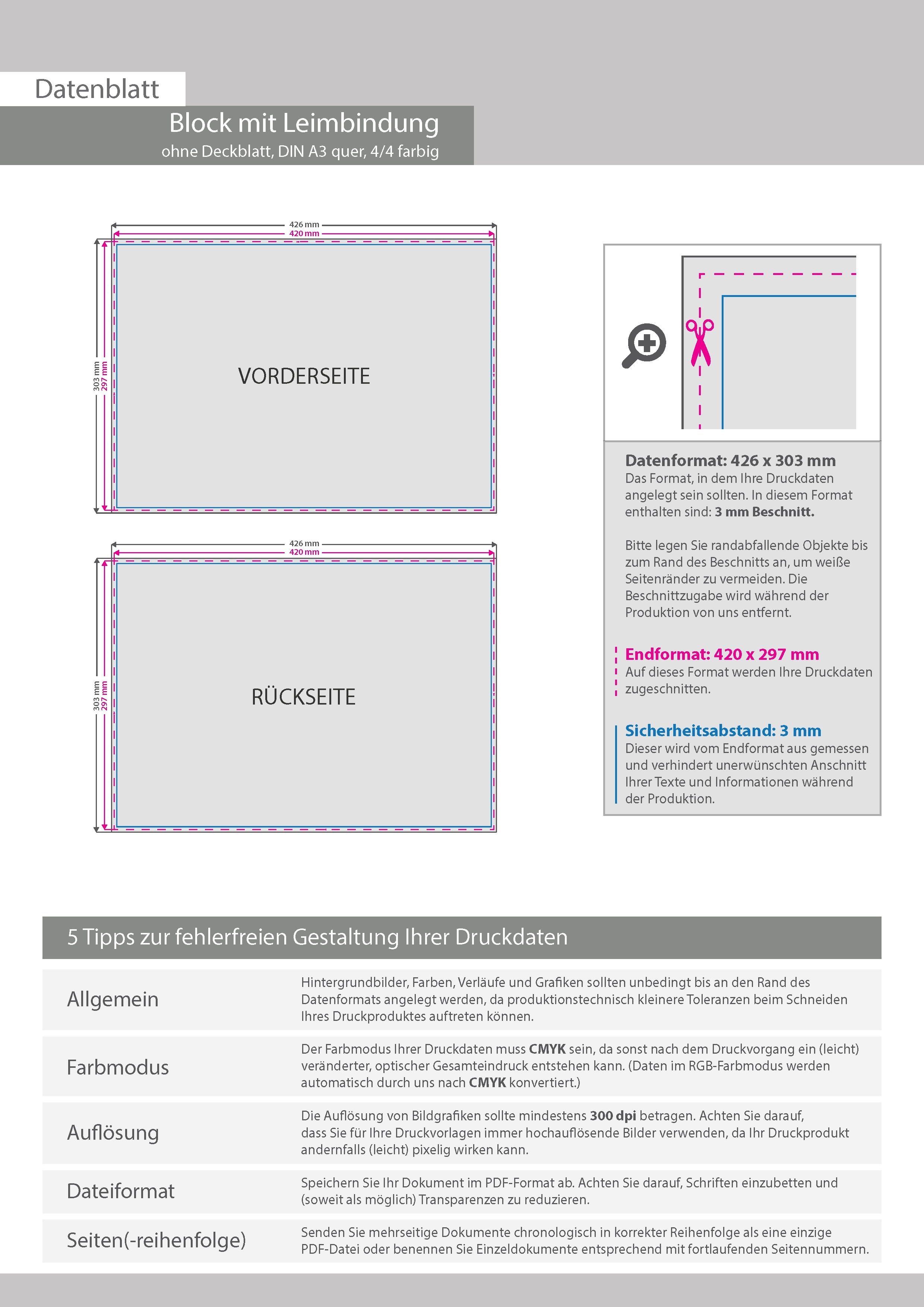 Block mit Leimbindung, DIN A3 quer, 10 Blatt, 4/4 farbig beidseitig bedruckt